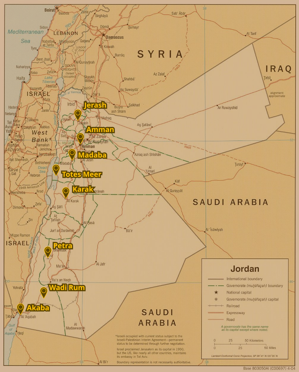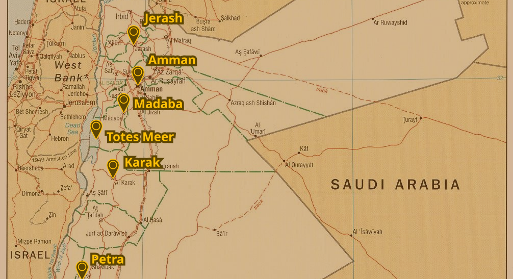 Reiseverlauf: Amman - Jerash - Madaba - Totes Meer - Kerak - Petra - Akaba - Wadi Rum