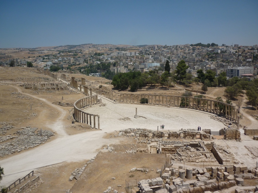 Nach einer knappen Stunden fahren wir ins kleine Dörfchen Jerash ein wo wir die gut erhaltenen Überreste der römischen Provinzstadt Gerasa besuchen. Diese Stadt ist so gut erhalten, dass man sich das Leben vor 2000 Jahren mit etwas Fantasie gut vorstellen kann. In unserem Reisehandbuch lesend, was viele geschichtliche Informationen enthält, schlendern wir durch diese faszinierenden Ruinen die Hinweise auf Besiedelung ab etwa 6000v.Ch. geben.