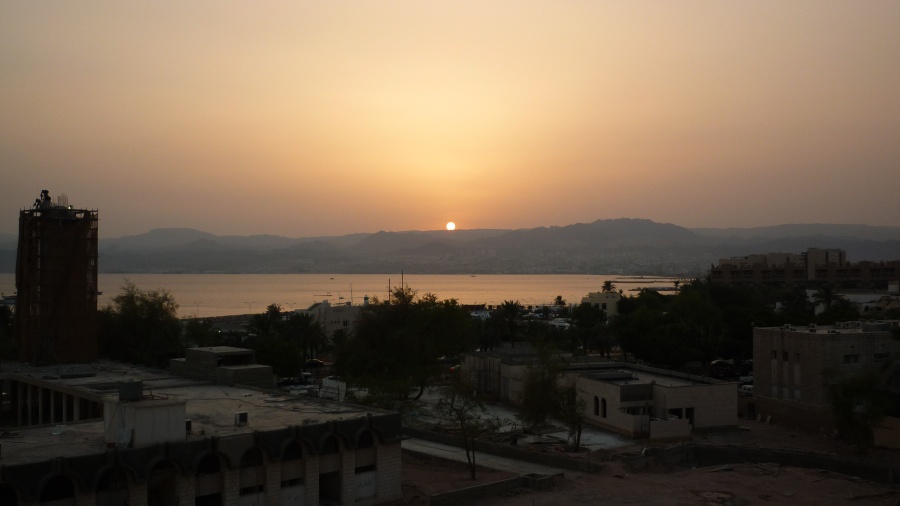 Nach dem Frühstück fahren wir los nach Ma'in. Die fahrt führt uns durch die trockene, vorwüstliche Landschaft auf dem östlichen Bergrücken des Jordangrabens, wo wir schon Bald den ersten Blick aufs Tote Meer geniessen können. Die Strasse schlängelt sich nun weiter 240m unterhalb des Meeresspiegels zum Hammamt Ma'in. Ein Ort wo etwa 50 heisse Quellen entspringen und die wasserreichste etwa 25m über Felsklippen abstürzt. Nach dem wir den Eintritt bezahlt und uns umgezogen haben, suchen wir uns einen Platz im Schatten, wo sich die Hitze entspannt aushalten lässt. So entspannen wir also in den heissen Quellen und danach im noch heisseren Türkischen Bad. Entspannt und wohlgelaunt fahren wir zurück nach Madaba und essen erst einmal leckere Kebab. Gleich am Dorfeingang besichtigen wir das flächenmässig grösste Mosaik in der Apostel-Kirche. Auf Podesten geht man hier den Seitenwänden entlang, sodass die unglaublich alten und gut erhalten Mosaike gut zu sehen sind. Danach schlendern wir weiter zur St. Georgs-Kirche – erbaut 1896 - mitten in der Stadt, wo das berühmte Mosaik der Palästinalandkarte zu sehen ist. Diese Karte stammt aus dem 6. Jh., ist ca. 15x6m gross und wurde aus 2,3 Millionen Steinen zusammengesetzt. Gut zu erkennen ist Jerusalem mit der Stadtmauer und dem Cardo Maximus. Grosse Teile wurden leider beim Neubau der Kirche zerstört. Unsere Mosaik-Tour geht weiter zum Archeological Park mit verschiedenen Gebäuden und weitern sehr grossen Mosaiken. Gleich am Eingang hängt das älteste Mosiak aus dem 1. Jh. v. Chr. Durch den Park hindurch verläuft die freigelegte römische Strasse Decumanus mit original Pflasterung. Daneben stehen verschiedene Kirchen und die eigentliche Austelllungsfläche. Auch hier geht man auf erhöhten Podesten um einen besseren Überblick zu haben. Langsam drängt die Zeit, wenn wir noch zum Museum wollen. Den Weg dahin zeigt uns ein Jordanier der darauf besteht, dass wir nach dem Museum bei ihm zum Tee vorbei kommen sollen. Das Museum ist leider schon zu, sodass wir gemütlich Richtung Hotel zurück laufen. Auf dem Weg treffen wir wieder den freundlichen Jordanier von vorher und diesmal besteht er auf seine Einladung zum Tee. Mit seinem Kleinbus fahren wir ein paar Strassen aus der Stadt zu einem Wohnquartier. Hier bittet uns Moaab in sein Haus, hoch aufs Dach. Von hier oben hat man laut Moaab die beste Aussicht auf den Sonnenuntergang über der Stadt. Dem war auch so. Bei Tee und interessanten Gesprächen über Schul-, Aus- und Weiterbildung – er selber war Ingenieur mit Lehrermandat – genossen wir den Sonnenuntergang über Madaba.