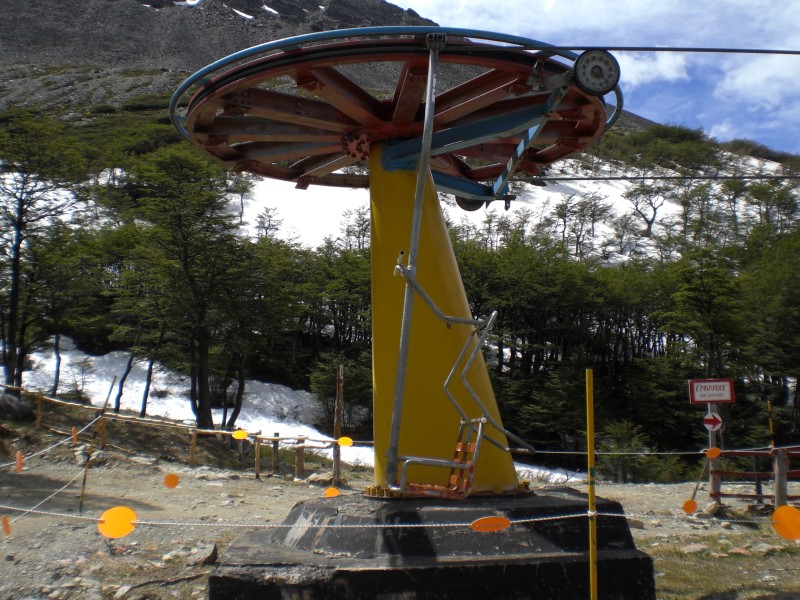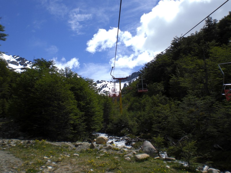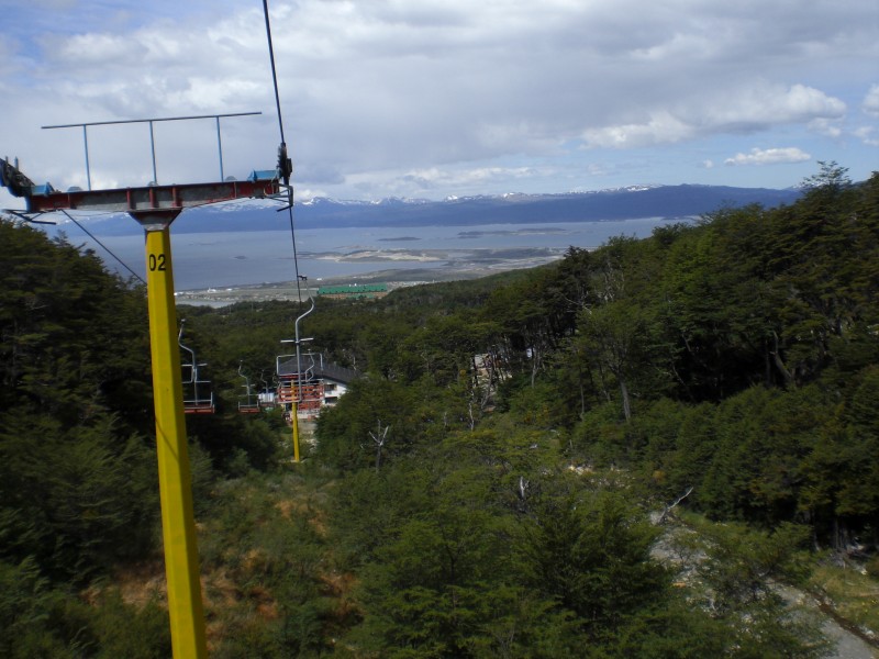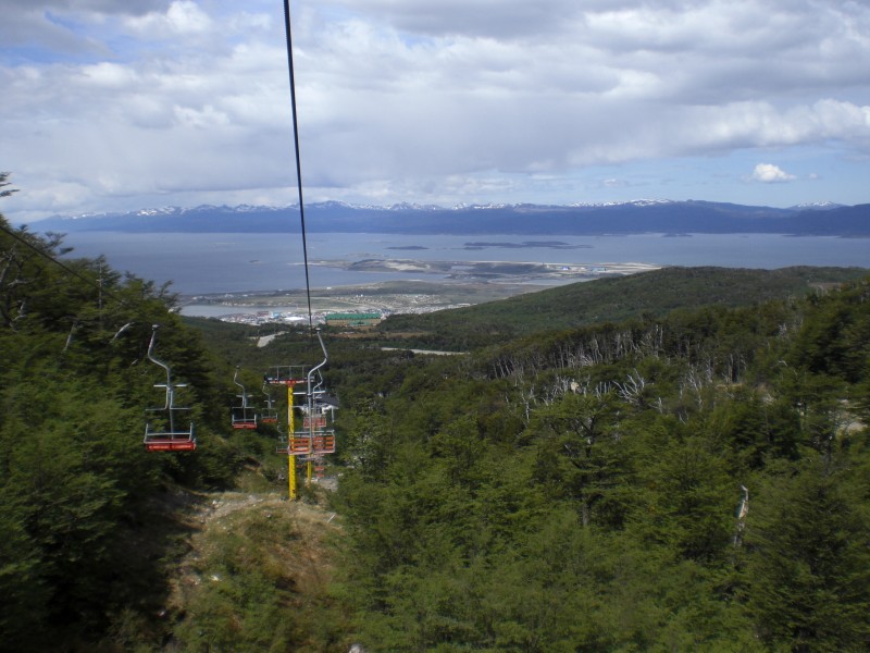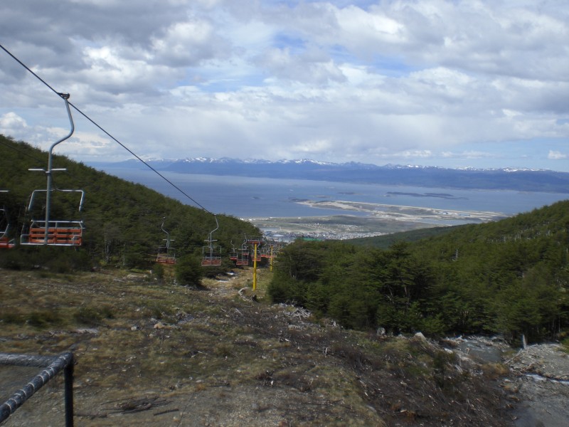 Vom Gletscher - eher ein kleiner, hat man einen traumhaften Ausblick auf Ushuaia und den Beagle-Kanal. Das Taxi bringt uns zur Talstation vom Sessellift - Model späte 70er. Von der Bergstation laufen wir dann noch etwas höher zum Gletscher.